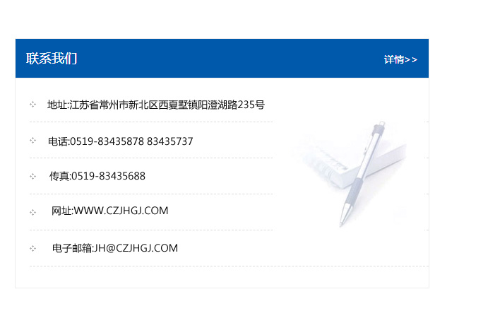 傳真:0519-83435688    郵編:213135    網址:WWW.czjhgj_com.ahztstny.com    電子郵箱:JH@czjhgj_com.ahztstny.com